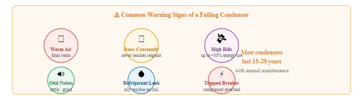 А failing or dirty condenser directly degrades your air conditioning system's performance and efficiency. Watch for these warning signs: